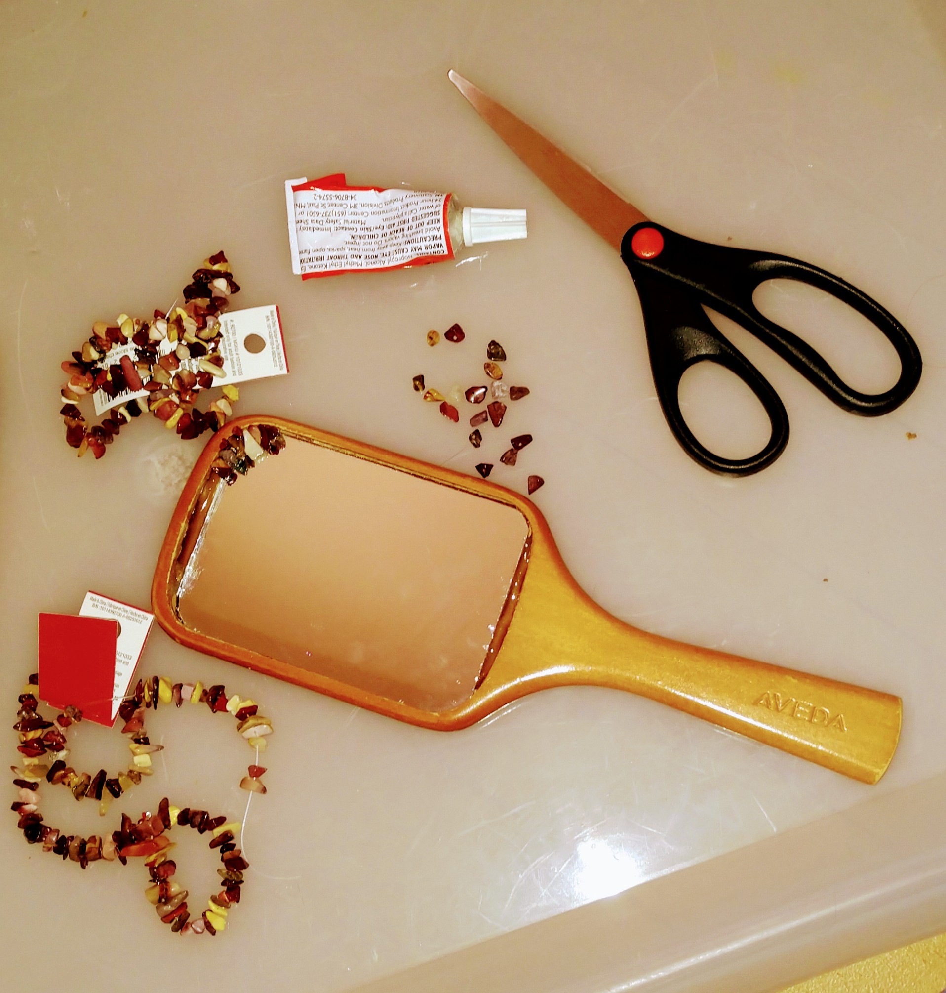 So…. empowered by this portent last night, I thought I would attach my adornments and surprise you with the completed project this morning…. LOL! LOL! (yes, 2 LOL’s and !’s) The mirror has been fixed in place with glue and the first half inch of rocks are in one corner… Now, this is a longer story of perseverance meeting exhaustion and no lighting along with fears of retinal transplants…