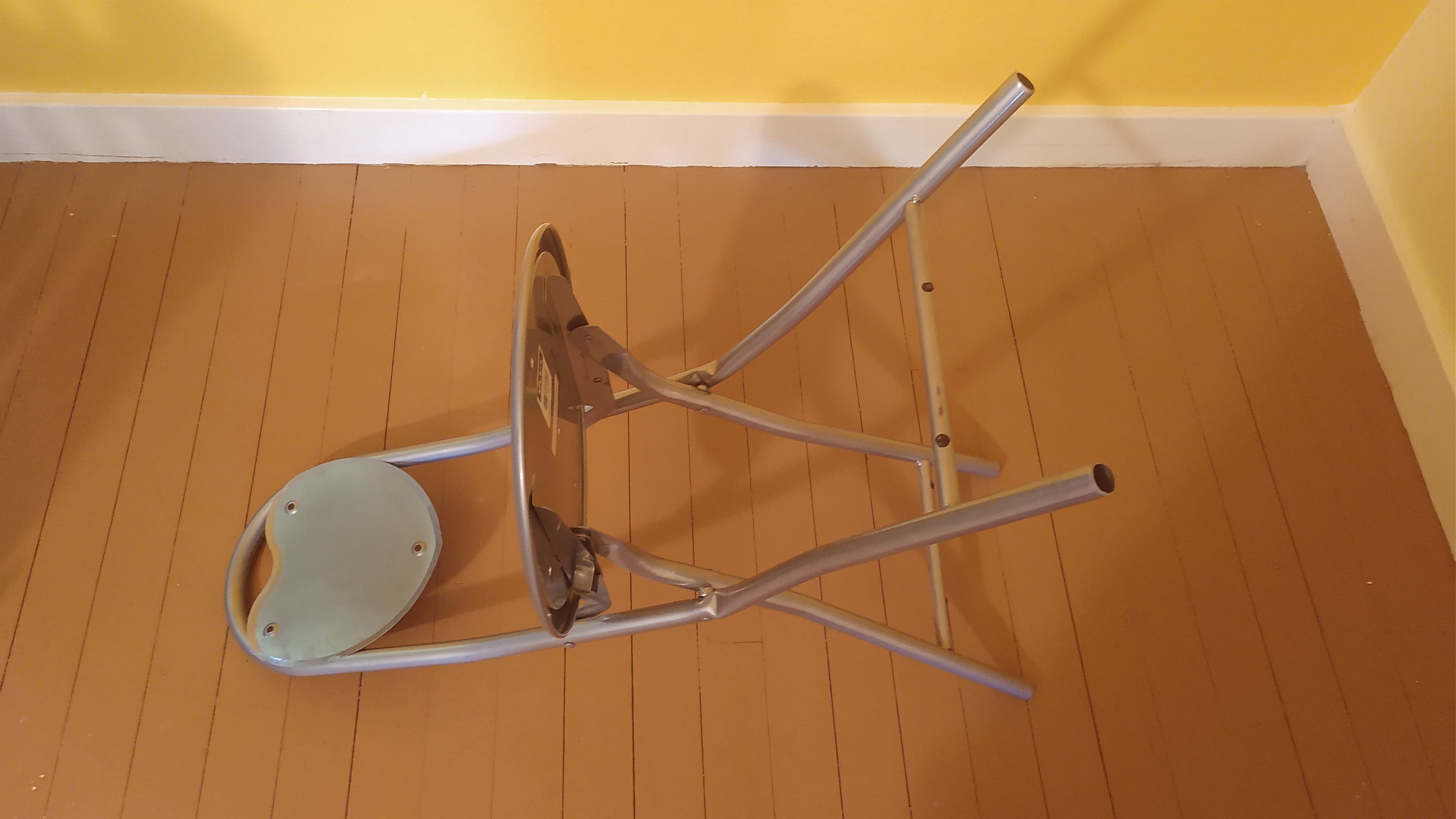 Off to an early lead, I decided to part out a chair with bent legs (it was tricky trying to sit on the seat while sliding forward after all…). The parts are properly stored as I still have its twin…. and the frame is off to scrap metal recycle. The crawl space also revealed an electric blanket and a space heater… now, destined for the hospice store and e-waste, respectively. 3 down 5 to go!